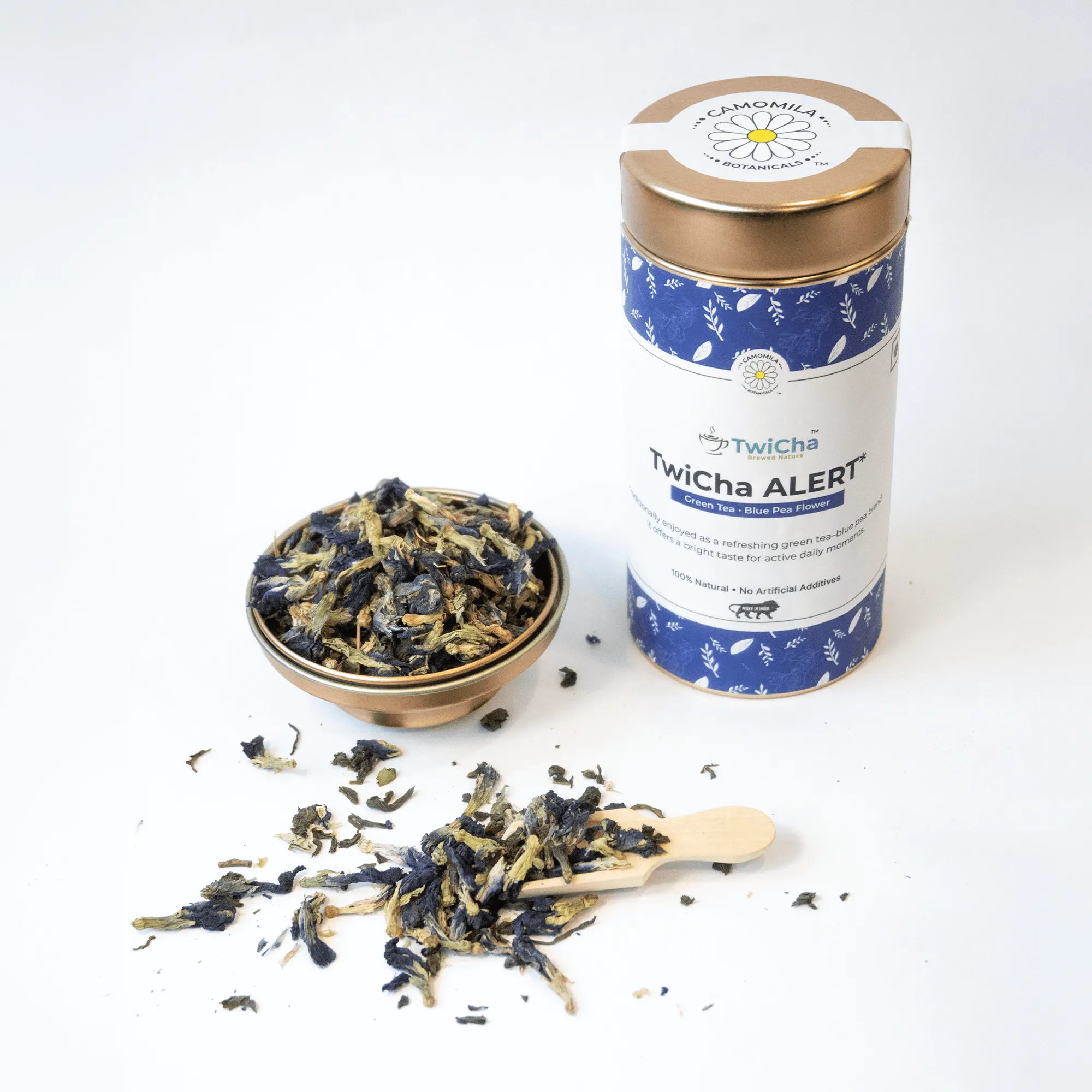 TwiCha ALERT is a vibrant blue pea green tea blend crafted with green tea and blue pea flower to create a refreshing botanical infusion with a striking natural blue color.