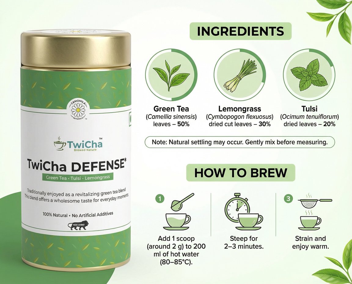 A cup of TwiCha DEFENSE transforms everyday tea breaks into refreshing moments. The citrus brightness of lemongrass, herbal warmth of tulsi, and smooth green tea base create a vibrant herbal tea designed for mindful living.