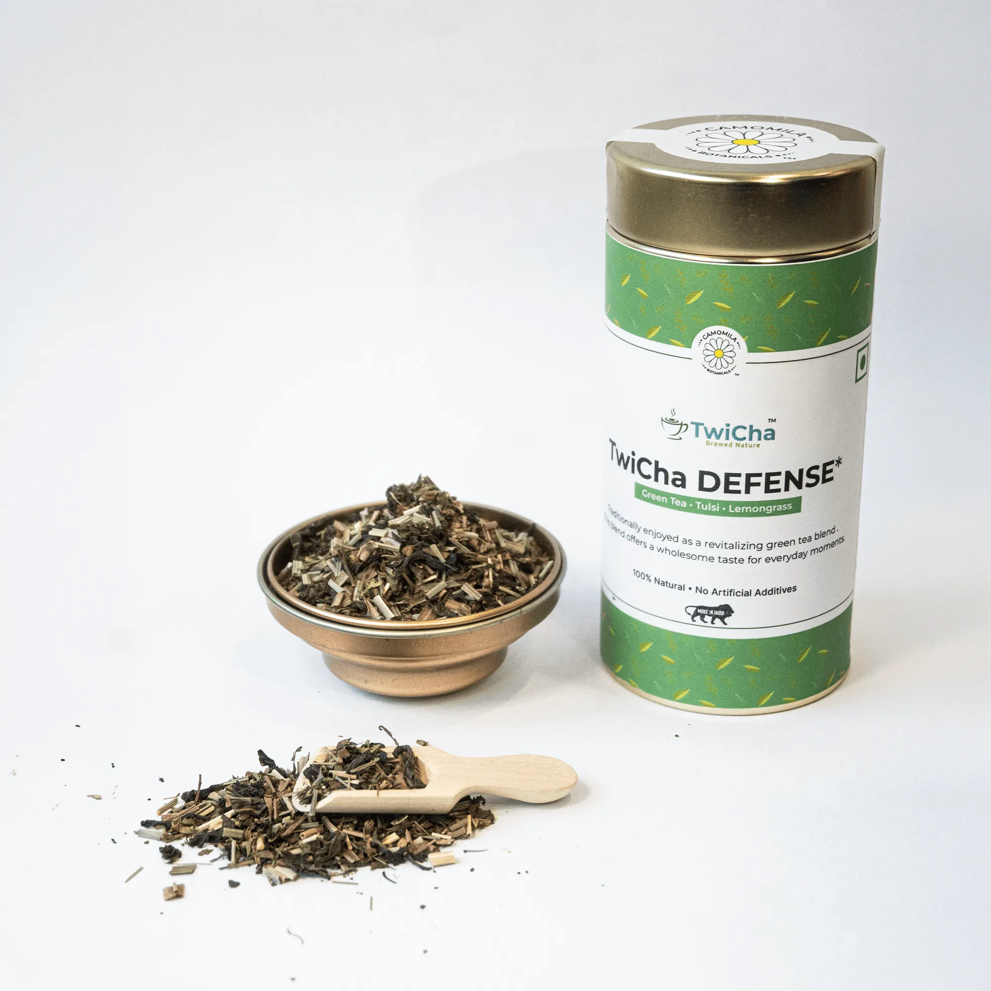 TwiCha Defense is a lemongrass green tea blend with tulsi from Camomila Botanicals designed to create a refreshing herbal tea for balanced daily routines.