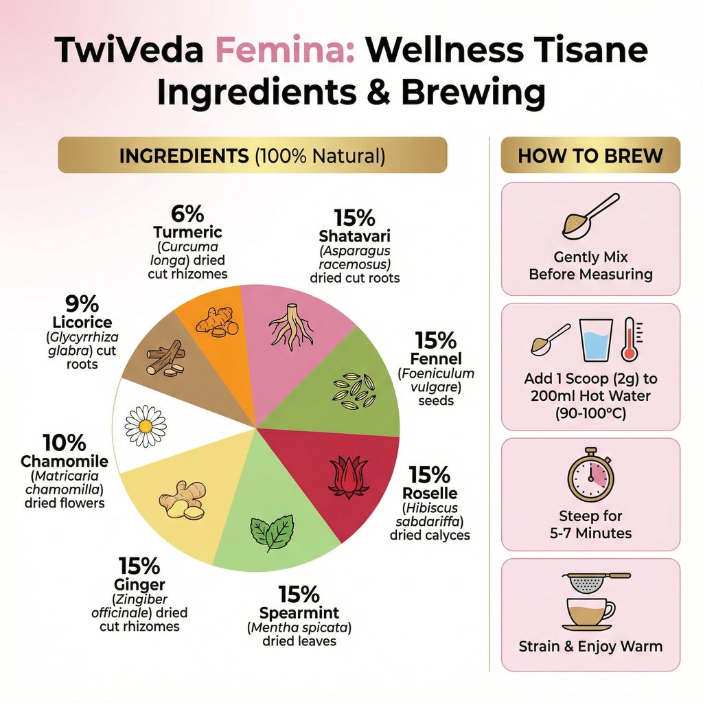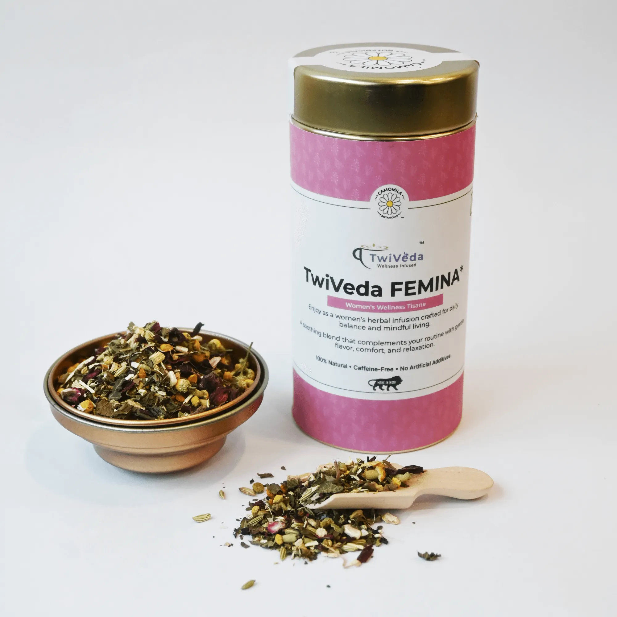 TwiVeda FEMINA is a carefully crafted caffeine-free herbal tisane designed to support comfort, balance, and mindful daily wellness routines.
